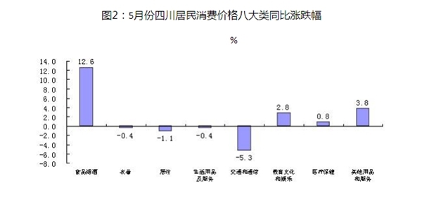 当前决定CPI同比涨幅回落的主要因素,依然是食品价格。5月,全省食品烟酒类价格同比上涨12.6%,涨幅较上月回落2.8个百分点。其中,猪肉、禽肉、食用油价格同比涨幅均有所回落。蛋类价格由涨转跌,同比下跌5.2%。鲜果、鲜菜价格分别同比下跌13.4%和3.9%,跌幅均有所扩大。