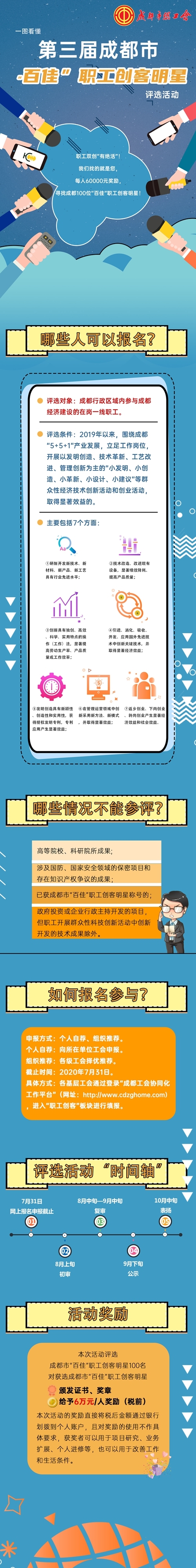 四川在线消息(记者 郝勇)“你在工作中开展的以发明创造、技术革新、工艺改进、管理创新为主的‘小发明、小创造、小革新、小设计、小建议’将受到关注,可参加‘百佳’职工创客明星评选,并给予重奖。”为激发成都广大职工创新创业热情,引导职工自觉践行新发展理念,团结动员全市职工为推动成都经济高质量发展作出新贡献,6月11日,第三届成都市“百佳”职工创客明星评选活动正式启动,本次活动将通过职工自荐及工会组织推荐相结合的形式,在全市职工中优中选优,评选出100名“百佳”职工创客明星。对获选职工将颁发证书、奖章,并给予6万元/人奖励(税前)。