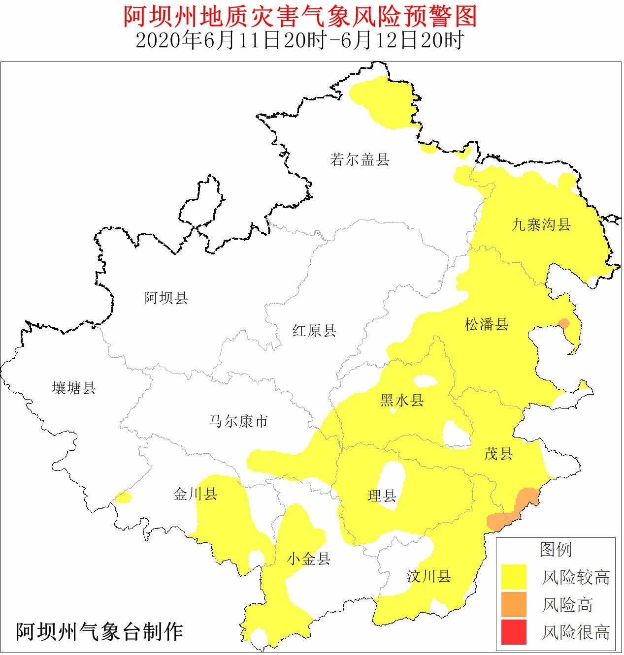 根据气象资料分析,6月11日20时-6月12日20时,汶川县、理县、茂县、松潘县、九寨沟县、金川县、小金县、黑水县、若尔盖县、红原县、马尔康市等11县(市)发生地质灾害气象风险等级较高,其中汶川县、茂县、松潘县的部分地方发生地质灾害气象风险等级高,请注意预防。