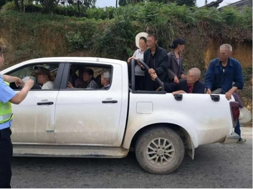 5月9日,一辆贵C2***5的小货车引起了古蔺交警的注意:经现场清点,核载5人的车厢里硬生生挤了8人(含1名幼儿),后面货箱里又蹲了10人,总共搭载18人!车厢挤了8人,更别谈系安全带了,不仅如此,连不能坐人的货箱都蹲了10人。