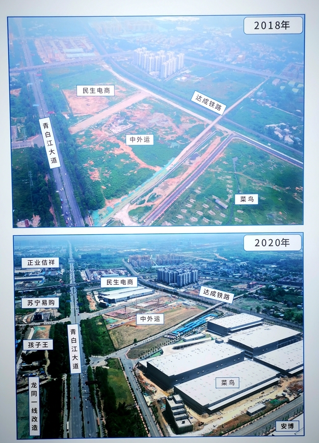 两张照片,展示的是成都国际铁路港新增功能区片区近两年来的变化,一批骨干项目先后入驻该片区,呈现出了热火朝天的景象。