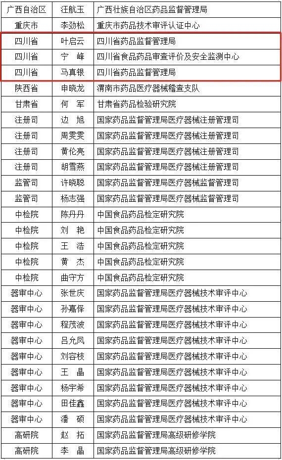 值得关注的是,四川共有3人名列其中,分别为来自四川省药品监督管理局的叶启云和马真银,以及来自四川省食品药品审查评价及安全监测中心的宁峰。
