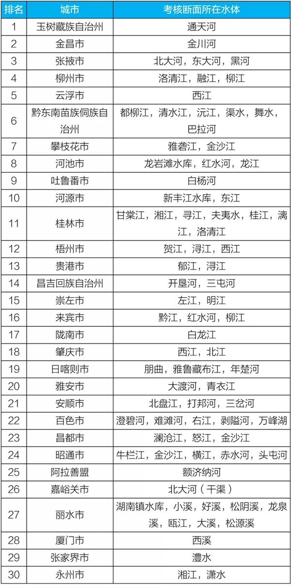 通报显示,2020年1-5月,全国地级及以上城市中,玉树、金昌、张掖等30个城市国家地表水考核断面水环境质量相对较好(从第1名至第30名),铜川、沧州、邢台等30个城市国家地表水考核断面水环境质量相对较差(从倒数第1名至倒数第30名)。