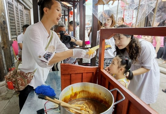“再吹一下就成功了!”吹糖人摊位前,小朋友的参与感爆棚。 郭超英 摄