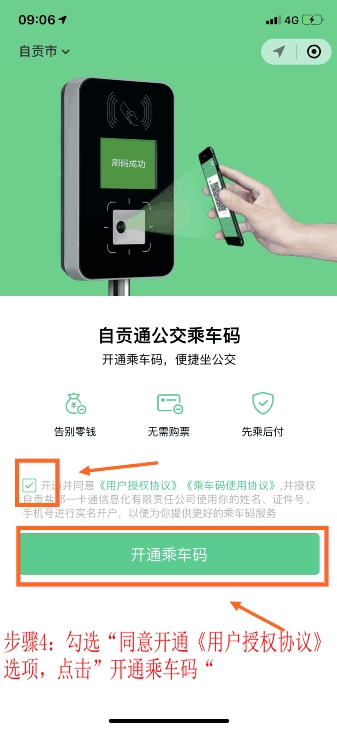 步骤四:勾选同意“用户授权协议”,点击“开通乘车码”