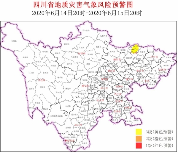 6月14日,省地质灾害指挥部办公室发布全省地质灾害气象风险预警,结合四川省气象台天气预报情况,6月14日20时~6月15日20时,广元市利州区、朝天区、昭化区为3级,黄色预警。