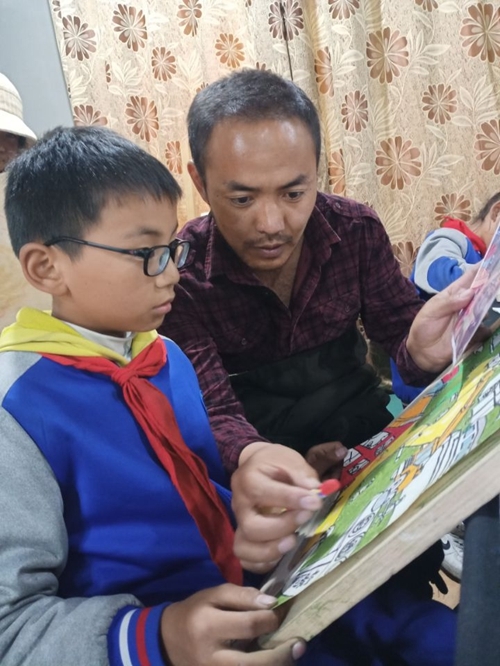 四年级1班的普巴甲今年12岁,学习绘画已经有两年时间。当天,他正专心致志地为一幅名为《抗疫》的图画上色。正当他为究竟是上黄色还是红色而纠结时,辅导老师尕让泽郎坐到他旁边,给他讲解上色的相关知识。