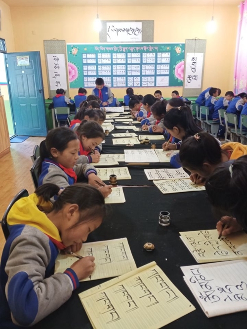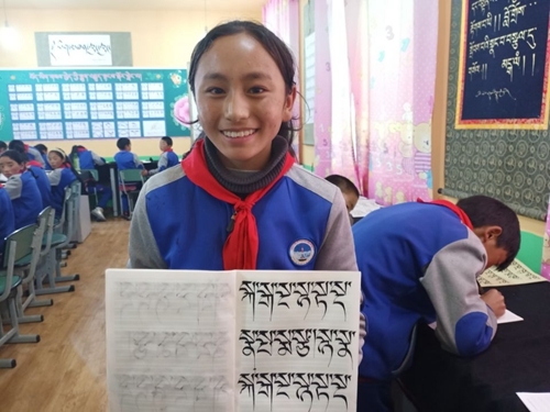 在藏文书法兴趣班里,秋忠杰趴在课桌上,认真地勾写着一笔一画。“孩子以前好动,做什么都难得专注,练习一段时间书法后,她做什么事都能一心一意。”辅导老师尕尔玛一边辅导孩子们写字,一边向记者介绍他们的情况。