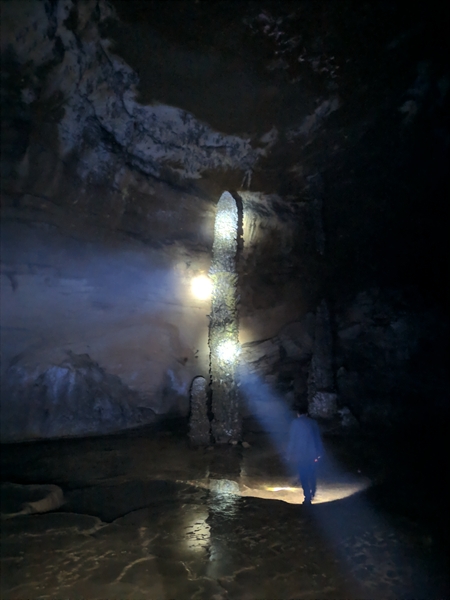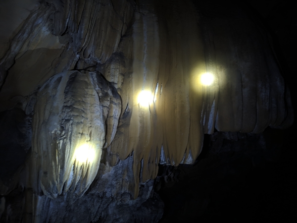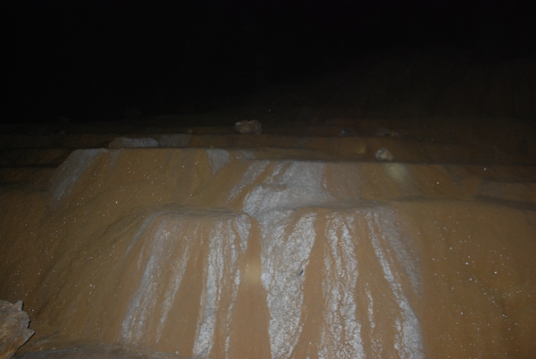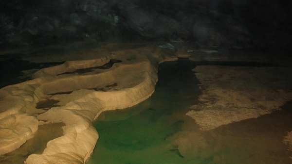 走入洞中,迎面传来水声。沉积物生成的景观形态精美、层次错落。