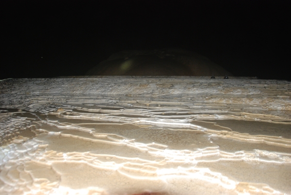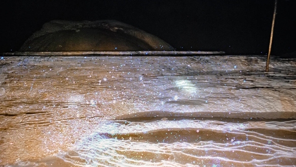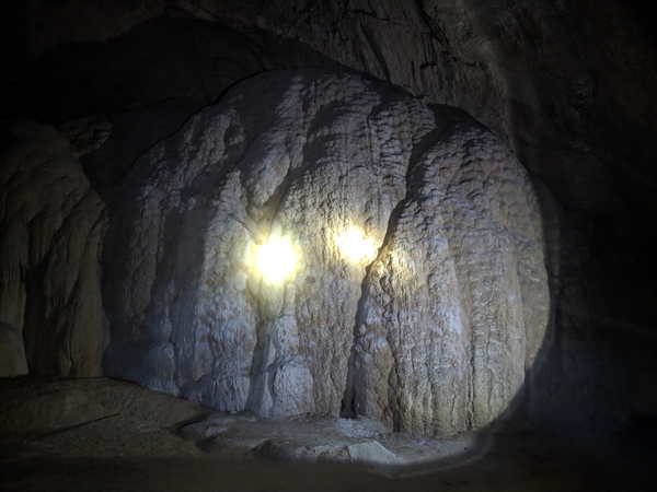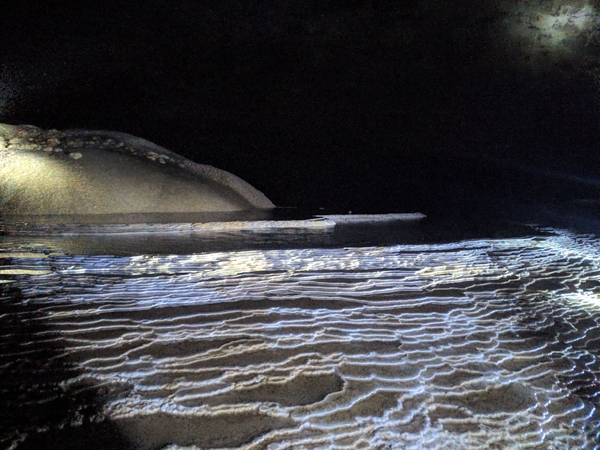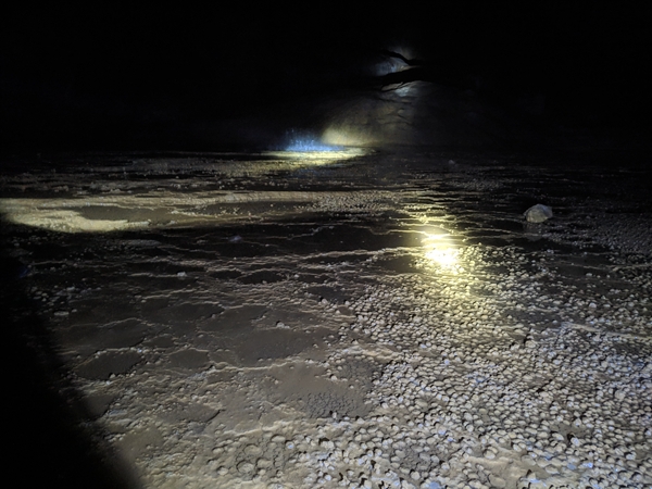 其中,最为奇特的钙华景观是“荧光海滩”。走到距洞口近2公里深的位置,手电筒照到的地方出现了一片晶莹剔透的“海滩”。据普查工作人员介绍,这是由于洞穴顶部泉水滴落到地面之后,一层层钙华沉积形成的。只要有一点光亮,水流过的钙华表面反射出柔和的荧光,像极了一排排海浪涌上来又退下去的闪闪发光的“荧光海滩”。