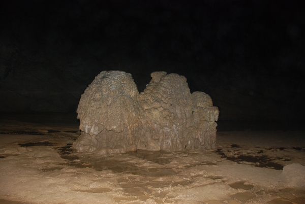 这是由岩溶泉、河、湖水沉积形成的碳酸钙累成形成的自然景观,石头质硬,致密,细晶质,块状,空心或实心球状。洞内最大的山河图高约2.5米。宽约2米,长1.5米,覆盖面积约20平方米。