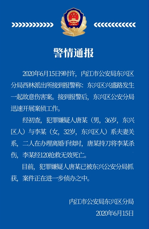 6月15日,内江市公安局东兴区分局发布警情通报称:2020年6月15日9时许,内江市公安局东兴区分局西林派出所接到报警:东兴区兴盛路发生一起故意伤害案。接到报警后,东兴区公安分局迅速开展案侦工作。