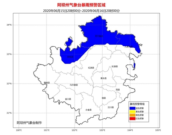 6月15日下午,阿坝州气象台同时发布暴雨蓝色预警、小流域山洪气象风险预警和地质灾害气象风险预警。