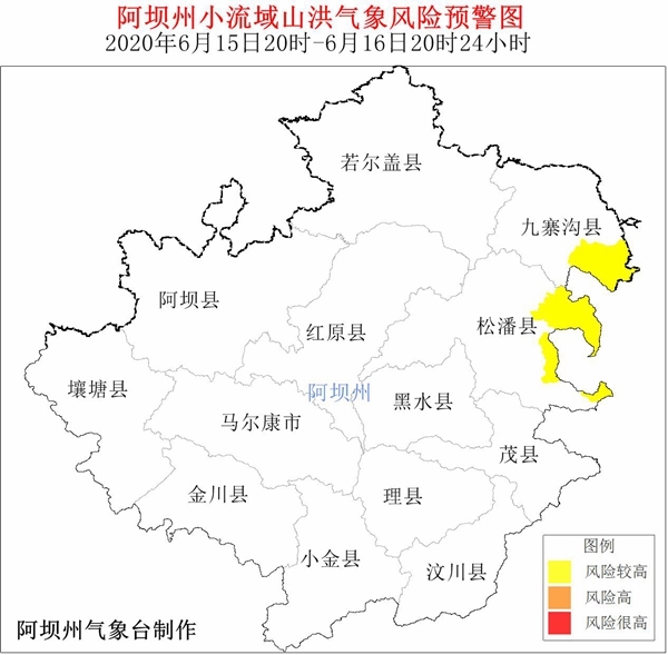 6月15日20时-6月16日20时24小时,松潘县、九寨沟县等2县发生山洪灾害气象风险等级较高,请注意预防。
