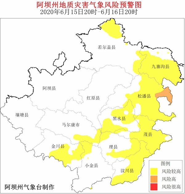 根据气象资料分析,6月15日20时-6月16日20时,汶川县、理县、茂县、松潘县、九寨沟县、金川县、小金县、黑水县、若尔盖县、红原县、马尔康市等11县(市)发生地质灾害气象风险等级较高,其中松潘县的部分地方发生地质灾害气象风险等级高。