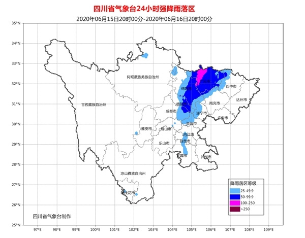 四川省气象台6月15日下午发布暴雨蓝色预警:今天晚上到明天白天,广元、绵阳、德阳3市及资阳、遂宁2市西部和成都市东部有大雨到暴雨(雨量35~80毫米),局部地方有大暴雨(雨量100~130毫米)。