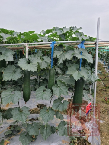 在冬瓜品种展示地里,37个品种依次排开,“站”在最外面的,是一种从未见过的大冬瓜。“一般冬瓜都是20多斤左右重,这个冬瓜品种可以长到40多斤”,园区技术人员介绍。
