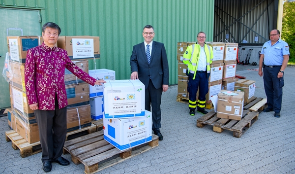 驻慕尼黑总领事张越先生(左一)出席防疫物资交接仪式,巴州内阁部部长赫尔曼博士(Dr. Florian Herrmann)(左二)代表州政府接收物资