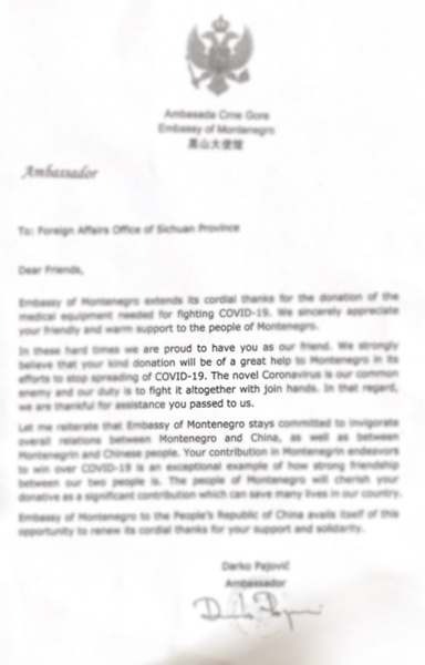 “贵省给卢森堡人民捐献的3万只医用外科口罩已经远远超过了其物资本身的价值,这尤其体现了一种非比寻常的团结。”卢森堡大公国副首相鲍施在感谢信中表示。“四川对黑山的捐赠可以挽救我们国家的许多生命,这也塑造了两国人民之间深厚友谊的典范。” 在接收到四川的捐赠物资后,黑山驻华大使帕约维奇表示了真挚的谢意。