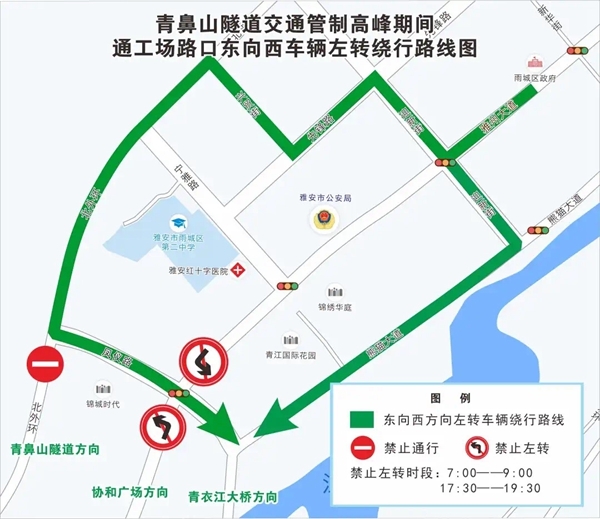 (二)高峰期间(7时至9时、17时30分至19时30分),雅州大道与凤仪路十字交叉路口(通工厂路口)东西方向通行的机动车禁止左转,由东向西方向左转机动车请提前在迎新街左转,或者绕行宁雅路-先锋路--兴贸街--北环东路--凤仪路--汉白玉大桥。