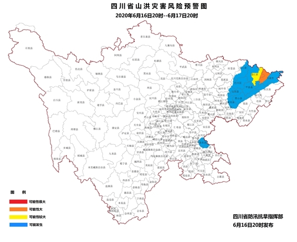 6月16日20时至17日20时,万源、通江等县(市、区)发生山洪灾害可能性大,南江、巴州、平昌、宣汉、仪陇、营山、蓬安、通川、隆昌等县(市、区)可能发生山洪灾害。