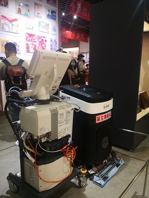除了常规的自动安检、体温监测,一进展厅,一个酷似大白、萌萌的机器人就朝观展的人们走来。这台自动消杀机器人在观展过程中可以自由移动。头顶两侧的喷头同时喷洒消毒液,实现无接触消毒杀菌、地面清洁。此次展览的承办单位——四川文化传播有限公司展览部负责人唐书婷介绍,这是为降低疫情感染风险,确保现场安全专门采购的。在四川抗疫中发挥重要作用的无人送餐机器人,也亮相此次专题展。