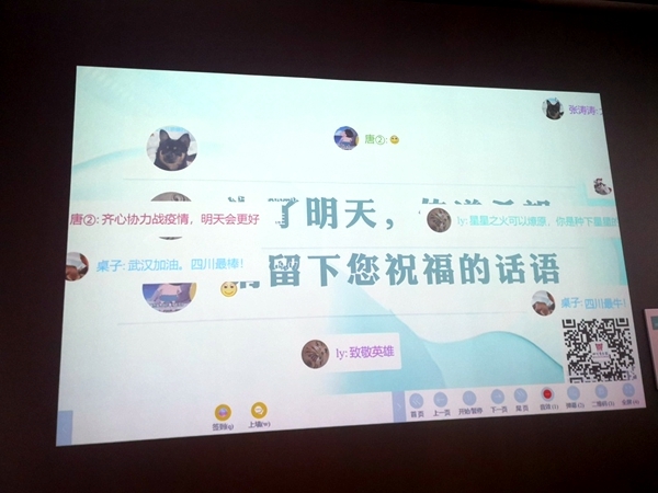 突破线上线下观展界限,在第四展厅的另一件展品——一面互动留言墙上得以实现。这是四川博物院为此次战疫展首次采用的科技手段。无论在现场或是云端,游客都可以扫描二维码,在对话框里写下你的感受,大屏幕就可实时显示,实现互动交流。