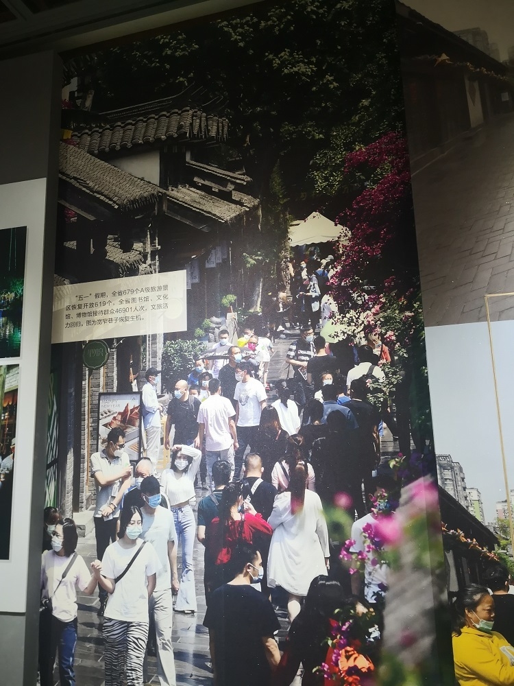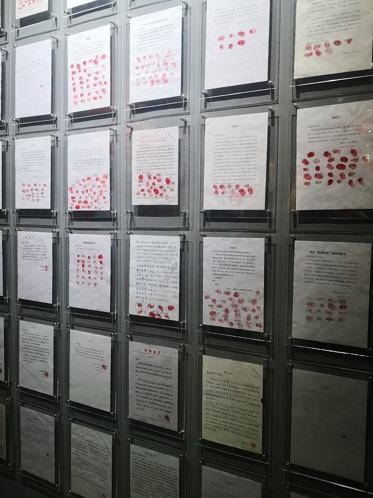 相比此前展出书画的展厅,细心的参观者会发现,这个展厅明显做了大幅的改动。大面积的玻璃柜少了,用于照亮展品的单个射灯少了,取而代之的是亮堂堂的大灯、层层叠叠的大小展品和铺满墙面的巨幅影像。唐书婷说,“以往四川博物院的书画展以幽静、精美、大气著称,突出单个展品。但作为战疫主题展,主办方希望尽可能接近群众和生活,真实呈现战疫过程,因此对展厅做了不小的改动,力求更接地气,更打动人心。”