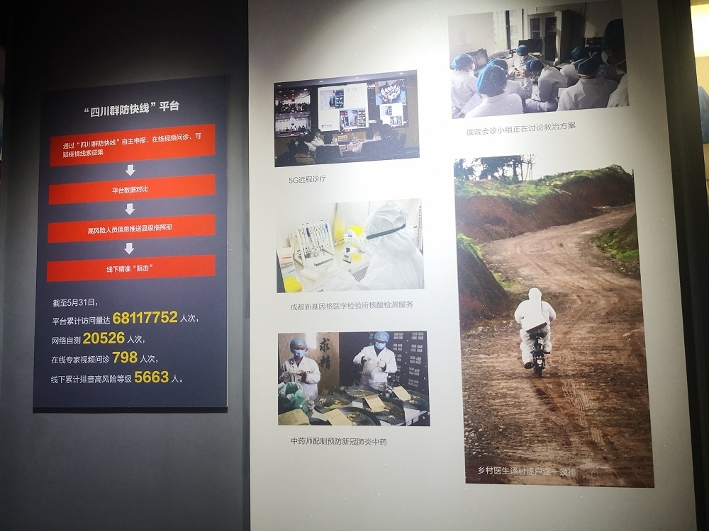 6月17日,开展首日,走进展厅,6个部分、4个单元共计1800多件展品依次陈列。从政府行动到民间战疫,从防疫政策到细化措施,从医护人员到普通群众,从5G远程诊疗尖端技术到普通的体温测量计…… 透过一件件实物、影像、数据等展品,一段持续数月、涉及不同领域、不同群体、不同职行业的四川战疫全貌得以呈现。