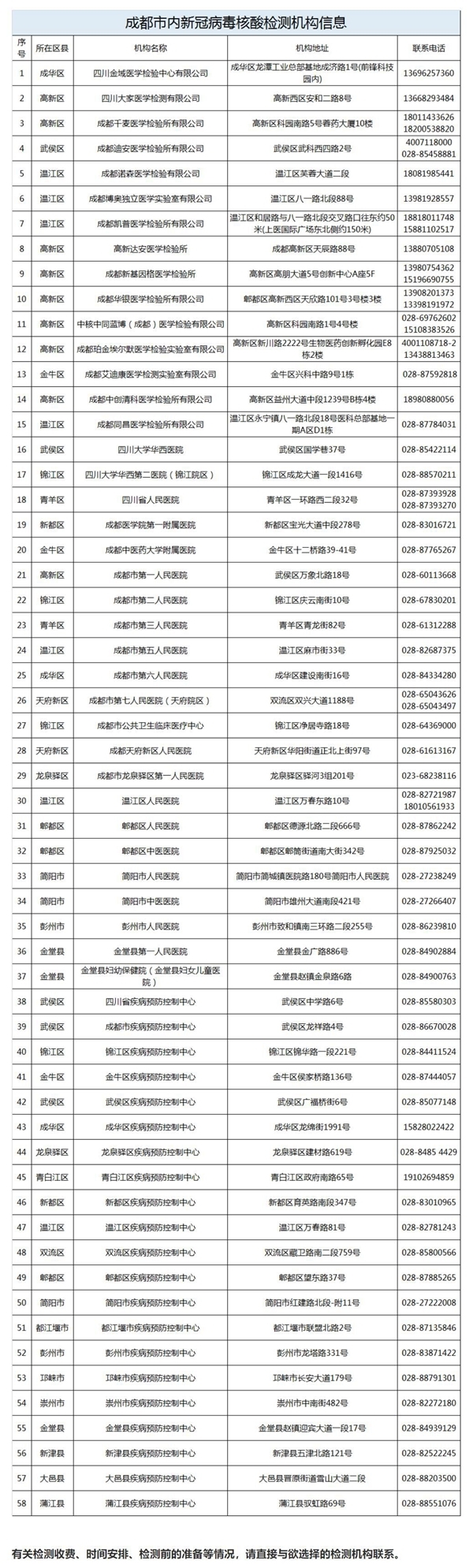 目前,成都市共有58家核酸检测机构。疾控机构仅承担指令性检测任务,不对外开展个人检测。