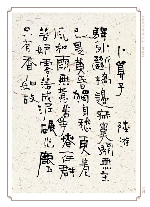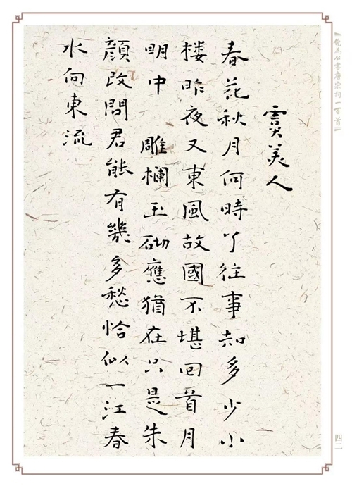翻开这本厚重的书法作品集,有唐宋词书法作品100幅,包括无名氏《蝶恋花》、李煜《虞美人》、晏殊《破阵子》、苏轼《念奴娇》、陆游《钗头凤》、辛弃疾之《南乡子》……或庄严或磅礴,或文静或飘逸。