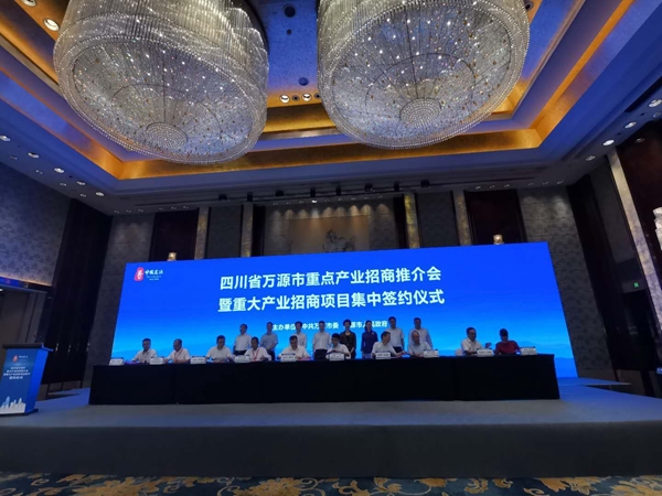 四川在线消息(记者 袁城霖)6月18日下午,万源市重点产业招商推介会暨重大产业招商项目集中签约仪式在重庆市渝中区举行,万源市同四川蓝臻农业科技有限公司、三亚派瑞酒店有限公司、重庆归鸿山旅游开发有限公司等10家企业就10个项目进行集中签约。项目投资总金额85.18亿元,涵盖富硒现代农业、生态工业、文化旅游等多个领域,将对进一步优化万源产业布局、提高城市经济综合竞争力发挥重要作用。