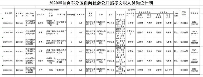 6月19日,记者从自贡军分区获悉,为延揽优秀社会人才加入国防和军队建设,根据全军统一部署,自贡军分区计划面向社会公开招考文职人员6名,主要招考科级副职以下管理岗位和初级专业技术岗位文职人员,招考专业包括管理学、教育学、文学、理学、工学、临床医学等。