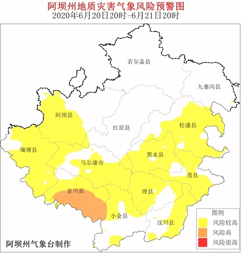 阿坝州气象台同时发布了地质灾害气象风险预警:根据气象资料分析,2020年6月20日20时至6月21日20时,汶川县、理县、茂县、松潘县、九寨沟县、金川县、小金县、黑水县、壤塘县、阿坝县、红原县、马尔康市等12县(市)发生地质灾害气象风险等级较高,其中金川县的部分地方发生地质灾害气象风险等级高。