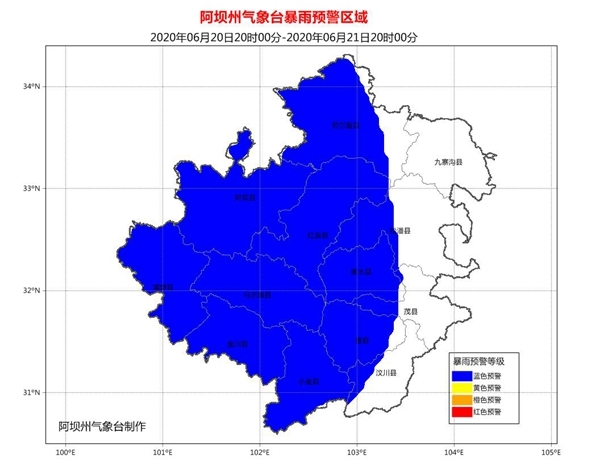 四川在线消息(记者 徐登林)6月20日下午,阿坝州气象台发布暴雨蓝色预警、小流域山洪气象风险预警和地质灾害气象风险预警。