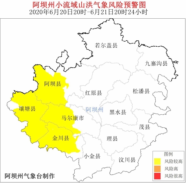 根据气象资料分析,20日20时-21日20时,汶川县、理县、茂县、松潘县、九寨沟县、金川县、小金县、黑水县、壤塘县、阿坝县、红原县、马尔康市等12县(市)发生地质灾害气象风险等级较高,其中金川县的部分地方发生地质灾害气象风险等级高,请注意预防。