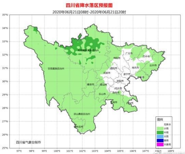 根据四川省气象台今天最新发布的天气预报,明天(6月21日)白天,省内各地的天气状况是酱紫:盆地大部阴天间多云,其中雅安、乐山、自贡、宜宾、泸州、广安、达州、巴中、广元9市和盆地西北部沿山有阵雨或雷雨;川西高原和攀西地区阴天间多云有阵雨或雷雨,其中阿坝州北部局部有中雨。