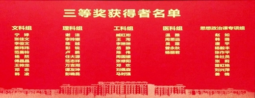 本届竞赛分为文科、理科、工科、医科和思想政治课专项等5个组别。经过预赛、决赛,92名选手脱颖而出,何家勇等10人分获5个组别一等奖,邢存宇等15人分获5个组别二等奖,宁婷等45人分获5个组别三等奖,胡晓帆等22人获得优秀奖。