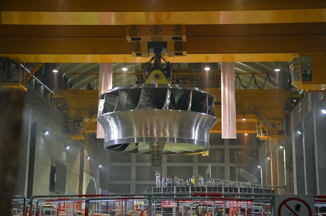 白鹤滩水电站左岸1号机转轮成功吊入机坑就位,标志着东方电气研制的全球首台百万千瓦水电机组精品转轮吊装成功。