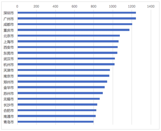 关注度指数的评价维度和数据来源主要为,网民在互联网的搜索量以及对各城市的认知和感兴趣程度进行的在线调查。关注度指数城市排名中,成都仅次于深圳、广州,位列第一梯队第三名。