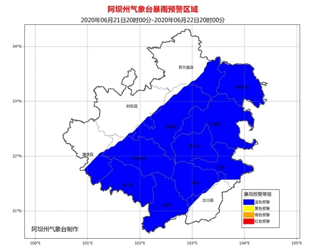 四川在线消息(记者 徐登林)6月21日下午,阿坝州气象台发布暴雨蓝色预警、小流域山洪气象风险预警和地质灾害气象风险预警。