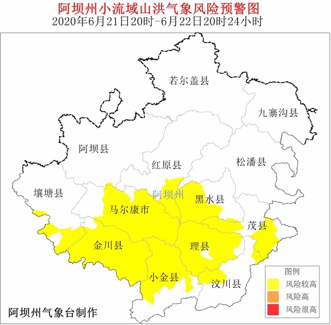 同时,21日20时-22日20时24小时,汶川县、理县、茂县、金川县、小金县、黑水县、壤塘县、红原县、马尔康市等9县(市)发生山洪灾害气象风险等级较高。