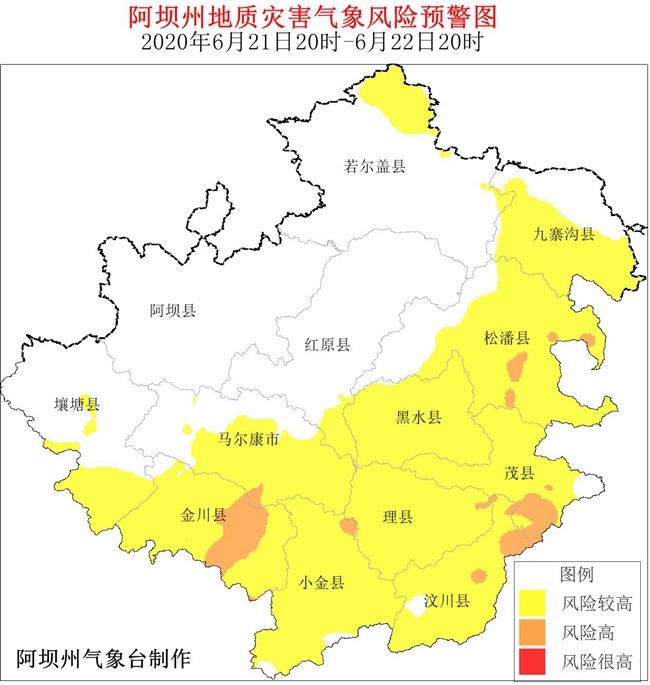 根据气象资料分析,21日20时-6月22日20时,汶川县、理县、茂县、松潘县、九寨沟县、金川县、小金县、黑水县、壤塘县、若尔盖县、红原县、马尔康市等12县(市)发生地质灾害气象风险等级较高,其中汶川县、理县、茂县、松潘县、金川县、小金县、马尔康市的部分地方发生地质灾害气象风险等级高,请注意预防。