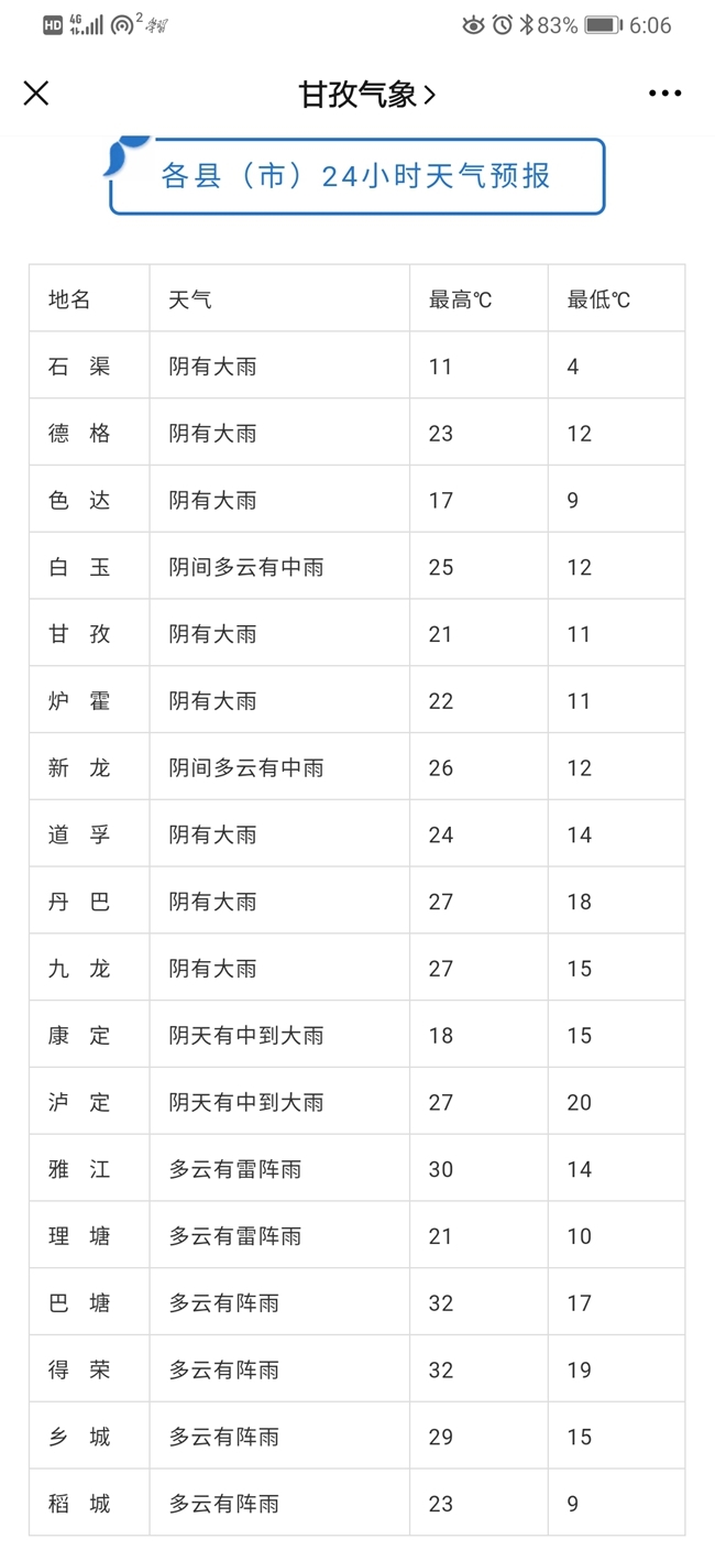四川在线消息(记者 游飞) 据最新气象资料分析,6月21日20时到23日20时,甘孜州北部、东部大部地区及理塘、雅江境内有中到大雨,部分乡镇有暴雨,东部个别乡镇有大暴雨。降水过程中伴有局地短时强降水、冰雹等强对流天气。需注意防范持续性降水可能引发的山洪、泥石流等地质灾害。