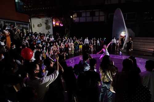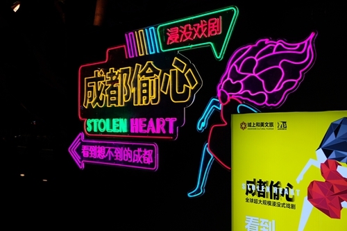 当晚,超过400米长的猛追湾,临时变为《成都偷心》流动式浸没剧场。锦江畔,巨幅偷心投影幕墙、遍布街区的偷心元素、吸睛的偷心霓虹灯墙,再加上闻讯赶来的数百位偷心粉丝,表演尚未开始,整个街区已经被偷心气氛浸没漫延。