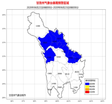 甘孜州气象台预计,6月22日08时到23日08时,丹巴县、道孚县、炉霍县、甘孜县、德格县、白玉县、色达县境内有暴雨。预计24小时内,上述地区将出现25毫米以上降雨,且局部有超过50毫米的降雨。