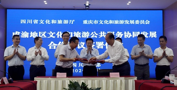 6月22日,巴蜀文化旅游走廊建设推进工作会在成都召开。这是继4月29日巴蜀文化旅游走廊建设专项工作组联席会第一次会议在重庆召开后,两地文旅部门的又一次正式会面。会上通报了四川重庆合作推动巴蜀文化旅游走廊近期推进情况,签署《成渝地区文化和旅游公共服务协同发展合作协议》、《关于建立成渝地区公共图书馆联盟的框架协议》。