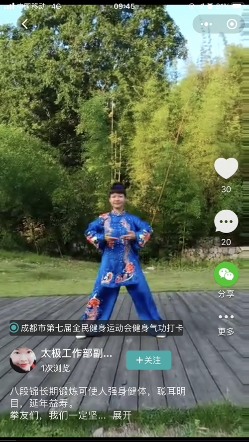 6月23日,“运动成都”成都市第七届全民健身运动会——“线上运动会”健身气功比赛正式开始通过成都市武术运动协会微信公众号进行展播评比。比赛旨在让更多市民避免疫情影响,积极参与到健身气功健身习练中来,养成良好的、科学的健身习惯。