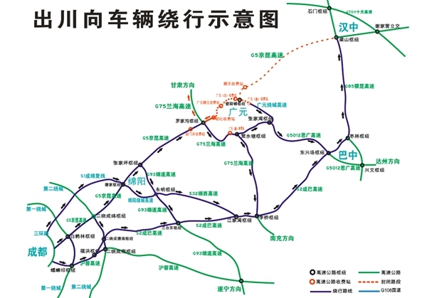 交通管制期间出川入陕车辆可选择绕行线路。以下为出川向车辆绕行示意图: