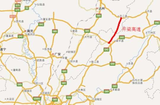开梁高速是达州市高速公路网的重要组成部分,位于达州市开江县桥亭村附近,与 G5012 恩广高速万达段相交,南下穿明月山,经甘棠镇东、任市镇东,止于新盛镇北永兴村附近,顺接开江至梁平高速公路重庆段,路线全长 30.424公里,设计速度采用100公里/小时,按双向四车道高速公路标准修建,路基宽度26米,总投资估算约为36.62亿元,平均每公里造价1.2亿元。